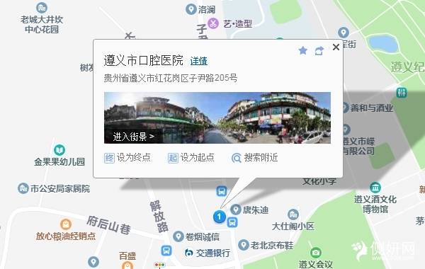 遵义站950米向北步行 到 高铁遵义站7站乘 303路 (董公寺方向) 或 26路 到 中山路280米向西南步行 到 遵义市红花岗区口腔医院