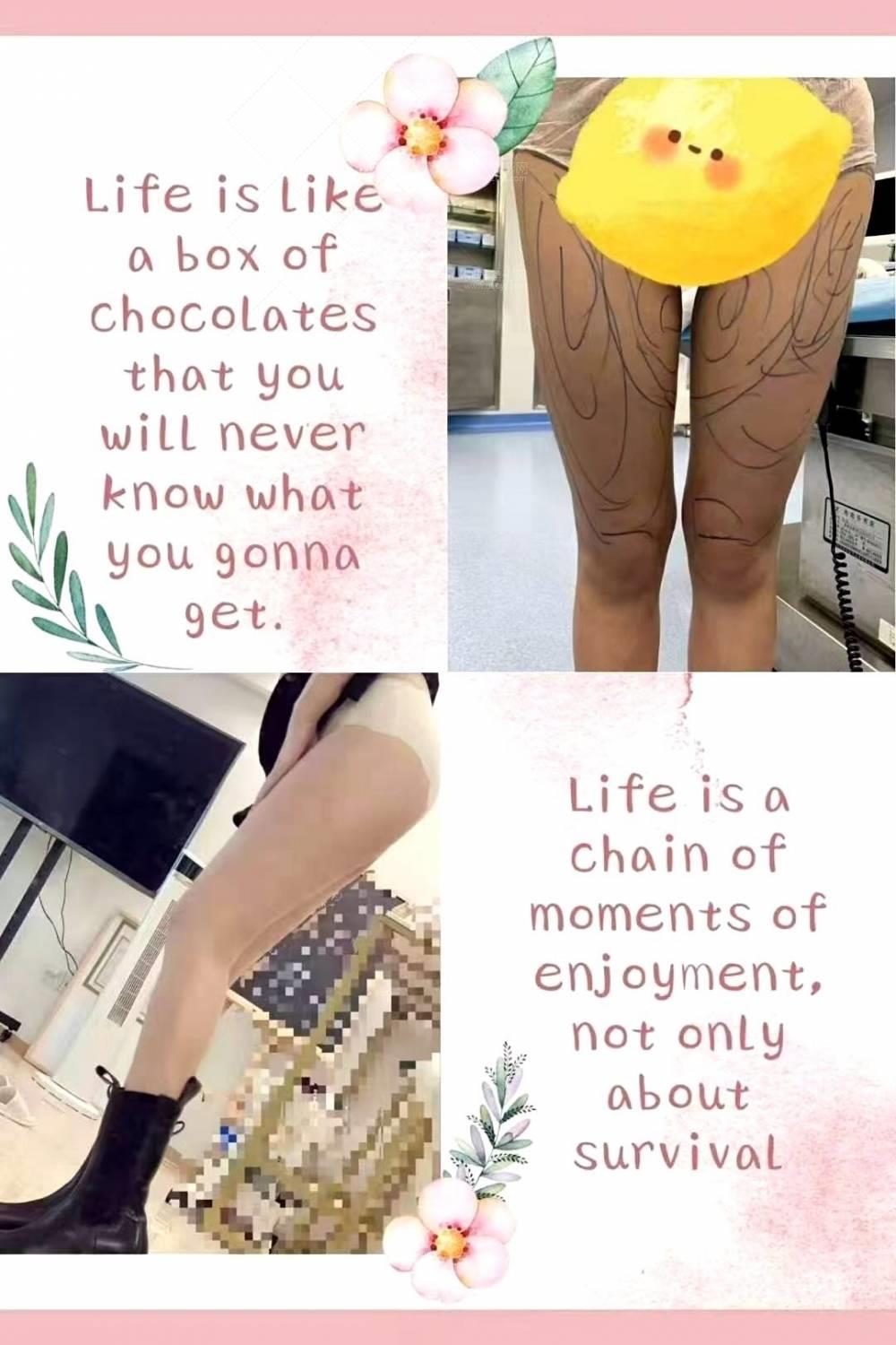 给你一组我大腿抽脂前分享的照片。主要是想记录下自己一路变美的历程。嘻嘻,从图中可以看出,我其实很幸运,腿上的脂肪堆积的有点多。就是因为这个大腿,我对穿短裤短裙没那么自信,所以预约了大腿抽脂。当然,我选择他家是有原因的。刚来面诊的时候被他家的环境吸引了。一进医院就觉得干净清爽。姐姐们也很热情,很体贴,整体感觉很舒服。其实我在准备手术的时候有点紧张,不过还好医院的姐姐们很贴心的安慰我。准备进手术室的时候,给我注射了麻药,几分钟就睡着了。哈哈哈,醒来的时候我已经在病房了,不过说实话,我真的没觉得疼。