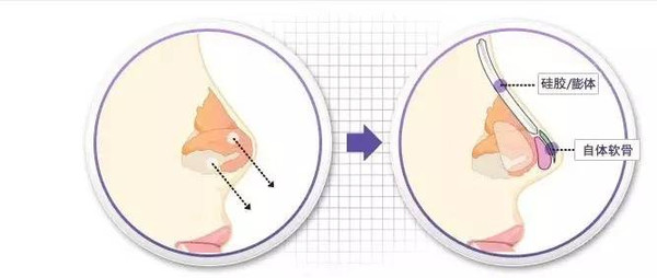 使用I形硅胶、膨体、Medpor(聚乙烯)或者L形硅胶假体,来垫高鼻梁,耳软骨雕塑后抬高鼻尖、突出鼻尖表现点,同时还可保护鼻头,以防止L形硅胶假体穿出。该手术方法适合鼻部基础较好的求美者。