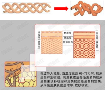 1.热作用导致的胶原纤维收缩:真皮乳头层中的水吸收红外光能转化热能,从而加热真皮组织,真皮层胶原质会立即收缩,使毛孔收细、松弛皮肤及皱纹被拉紧。