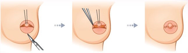 1. 局部麻醉乳头周围,再切开乳头两边约3mm。