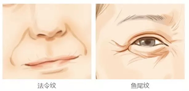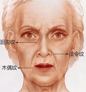 眼袋、泪沟、苹果机塌陷、鼻唇沟加深、前颊部脂肪堆积、后颊部脂肪缺失。