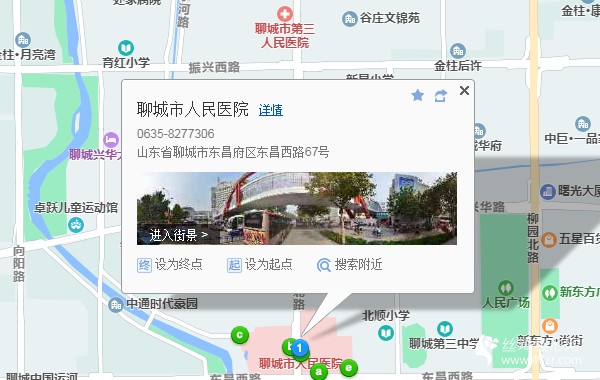 聊城站450米向东南步行 到 聊城汽车西站6站乘 603路 (位山湿地公园方向) 到 市医院280米向西北步行 到 聊城市人民医院