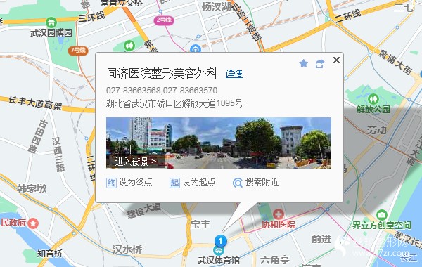武汉青山客运站280米向西步行 到 友谊大道112街坊11站乘 610路 (汉口火车站方向) 到 解放大道劳动街4米站内换乘 508路6站乘 508路 (工农路舵落口方向) 或549路 712路 电3路 到 解放大道航空路420米向西南步行 到 同济医院整形美容外科