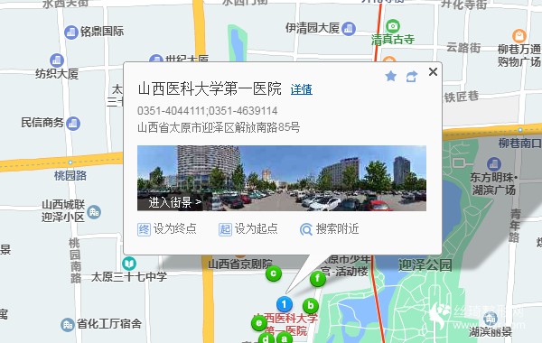 太原站970米向西步行 到 广场4站乘 65路支线 (长风商务区方向) 或65路 到 山大一院2米向北步行 到 山大一院
