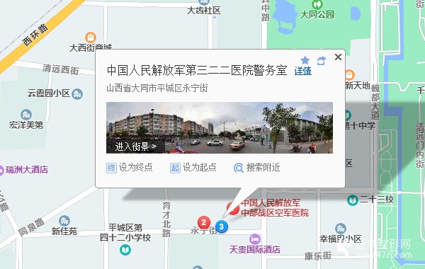 大同汽车客运东站270米向东南步行 到 大同汽车客运东站12站乘 66路 (大同站方向) 到 大同四中5米站内换乘 11路右环9站乘 11路右环 (物资园小区方向) 到 三二二医院60米向南步行 到 解放军第三二二医院-东门