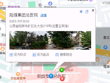 阳泉站110米向南步行 到 火车站9站乘 20路 (水泉沟方向) 到 阳煤集团70米向西步行 到 阳煤集团总医院