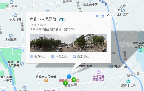焦作站390米向北步行 到 火车站5站乘 7路区间 (宇航重工方向) 到 人民医院120米向东步行 到 焦作市人民医院,