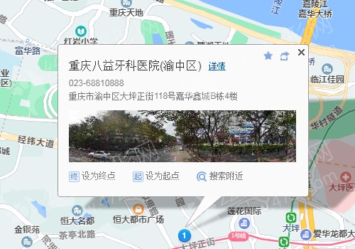 重庆汽车站650米向北步行 到 两路口 5口 进站2站乘 轨道交通1号线 (璧山方向) 到 大坪 1口 出站660米向西步行 到 重庆八益牙科医院(渝中区)