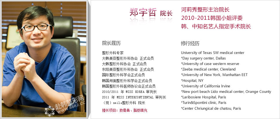 - 韩国smile整形外科位于韩国首尔富人区——江南区,医院附近聚集了韩国最大的几个韩国艺人经纪公司,也是众多韩国艺人经常访问的一个医院,代表院长郑宇哲院长也特别是韩国著名明星河莉秀的主刀医… 【详情】