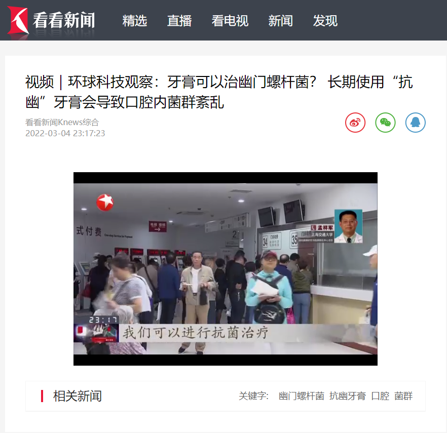 【东方卫视】环球科技观察:牙膏可以治幽门螺杆菌? 长期使用“抗幽”牙膏会导致口腔内菌群紊乱