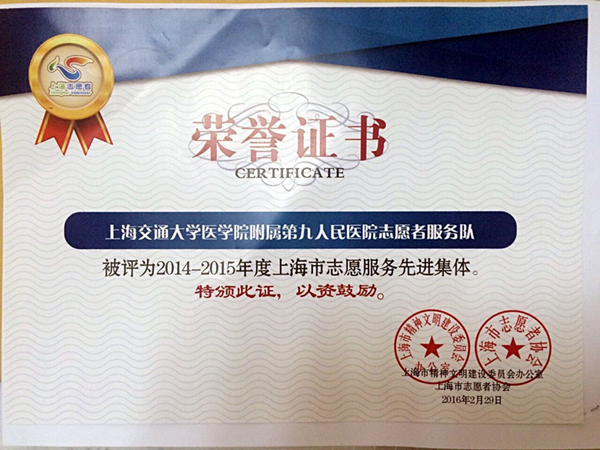上海九院志愿服务队获2014-2015年度上海市“志愿服务先进集体”称号