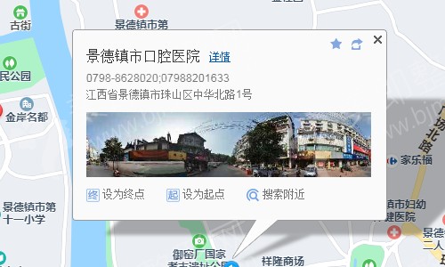 景德镇站260米向北步行 到 汽车长途东站5站乘 游1路 (罗家方向) 到 医药公司250米向西步行 到 景德镇市口腔医院