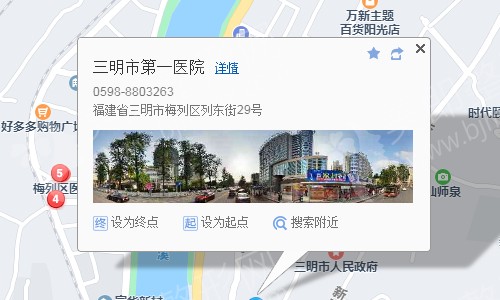 三明站500米向南步行 到 三明站(东)5站乘 D35路 (小蕉方向) 到 市政府590米向西南步行 到 三明市第一医院