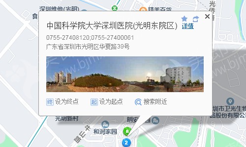 中国科学院大学深圳医院有两个院区,东院区位于广东省深圳市光明新区华夏路39号,始建于2018年4月,占地面积8.5万平方米,建筑面积14.0万平方米,是一所集医疗、急救、科教、预防保健康复于一体的二级甲等综合性医院,是深圳市医保和新农合定点医院,是中国科学院大学教学医院,先后荣获广东省县域(区)优秀医院管理团队、广东省医院协会单位会员、深圳市社会医疗保险先进单位、深圳市社会保险定点医疗机构信用等级AAA级单位等荣誉称号。
