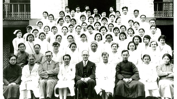 仁济女医院工作人员合影,前排左起乐以成、冷玉蓉、胡祖遗、刘恩兰、李哲士、韩芳卿、杜顺德、吴修贞、肖淑明(2馆)