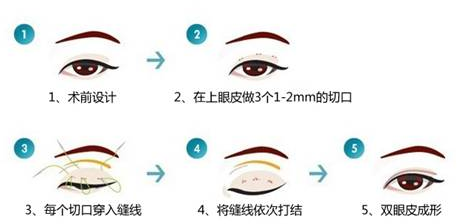 韩式三点法在眼皮上做三个长度仅2-3毫米的不连续微创切开,由三个切开抽取眼泡多余脂肪,再将切口缝合固定,形成重睑。术后眼睛自然美观,双眼皮成型效果永久,消肿更快,恢复周期更短。