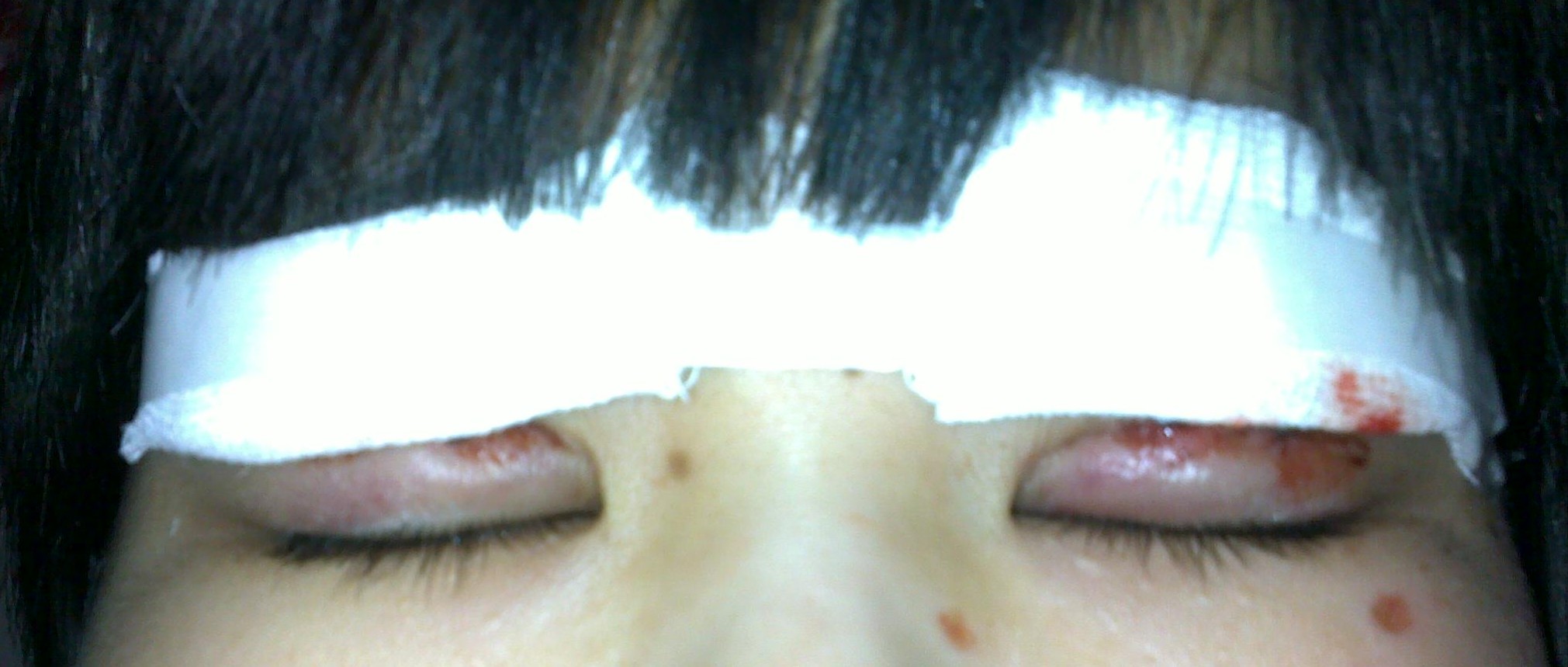 下面的图这是第四天 也就是今天刚拍的 还是很肿 但是恢复的还算不错 眼皮已经由充血的红色 变为淤青的紫色再变为黄色 代表正在慢慢消肿变好