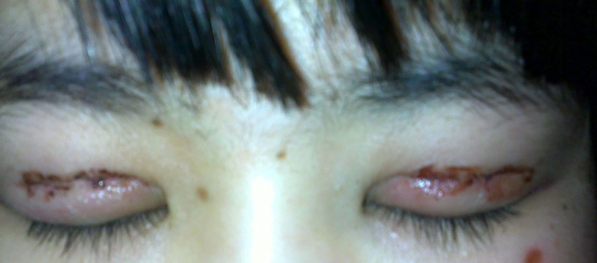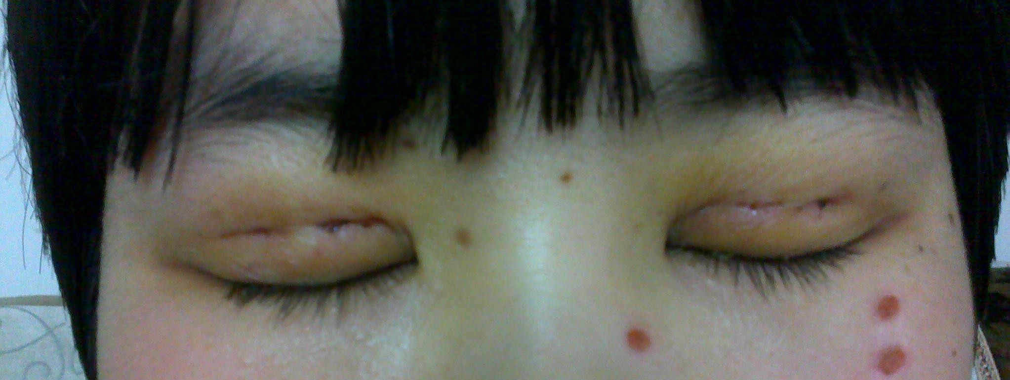 这是第二天睁开眼的的样子 很肿 充血 睁眼很吃力 有拉扯感