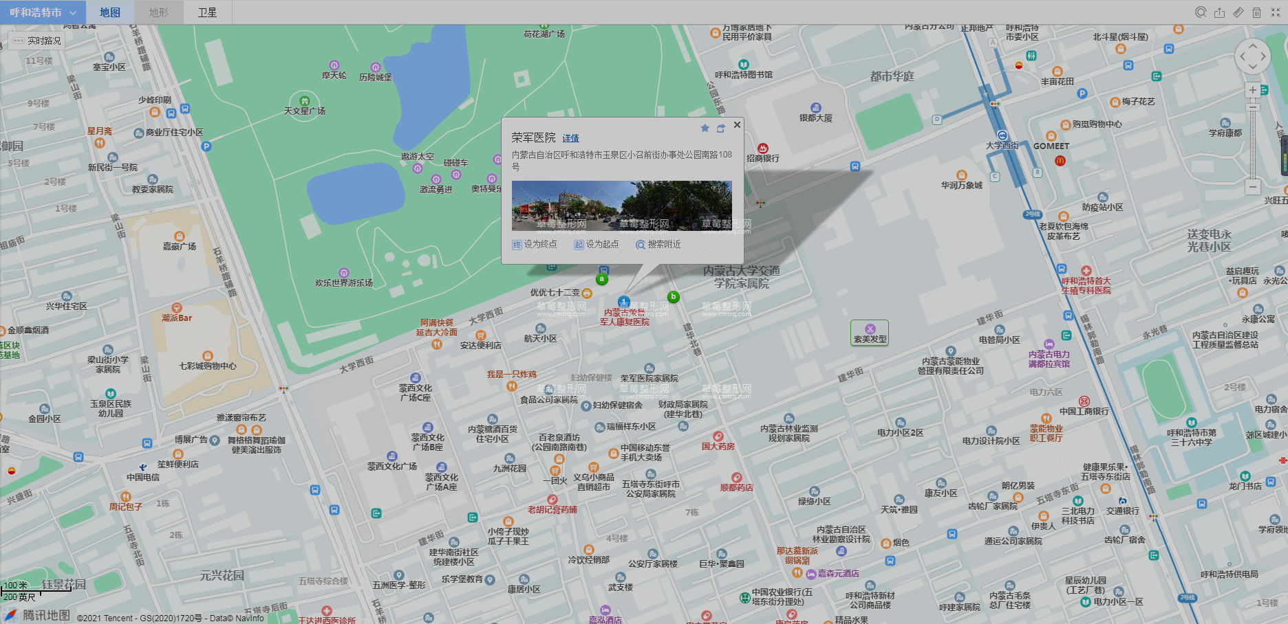 呼和浩特站370米向南步行 到 火车站5站乘 34路 (格尔图方向) 到 学府康都690米向西南步行 到 荣军医院,