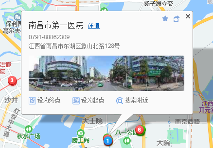 南昌西站110米向南步行 到 南昌西站 出入口 进站11站乘 地铁2号线 (辛家庵方向) 到 阳明公园620米向东步行 到 八一桥3站乘 52路 (火车站方向) 或 230路 到 南昌市第一医院20米向北步行 到 南昌市第一医院