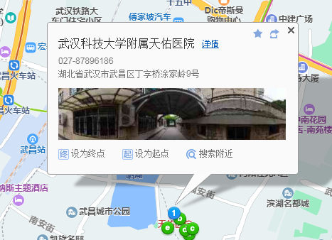 武汉站60米向东北步行 到 武汉火车站 出入口进站11站乘 轨道交通4号线 (柏林方向) 到 洪山广场 F2口 出站210米向东步行 到 洪山广场地铁站4站乘 电8路 (武昌火车站公交场站方向) 到 丁字桥路涂家岭550米向西北步行 到 武汉科技大学附属天佑医院