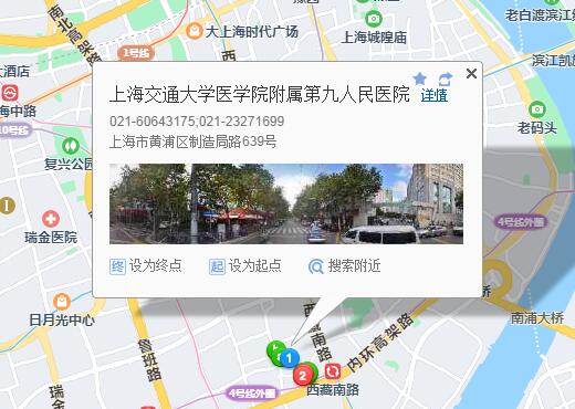 上海当代艺术博物馆790米向北步行 到 南浦大桥(沪军营路)3站乘 18路 (鲁迅公园方向) 到 市九医院270米向东南步行 到 上海交通大学医学院附属第九人民医院