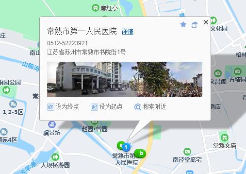 江南大厦(海虞南路)760米向西北步行 到 阜湖路3站乘 常熟11路 (元和公交首末站方向) 到 环城南路(书院街口)340米向西北步行 到 常熟市第一人民医院。