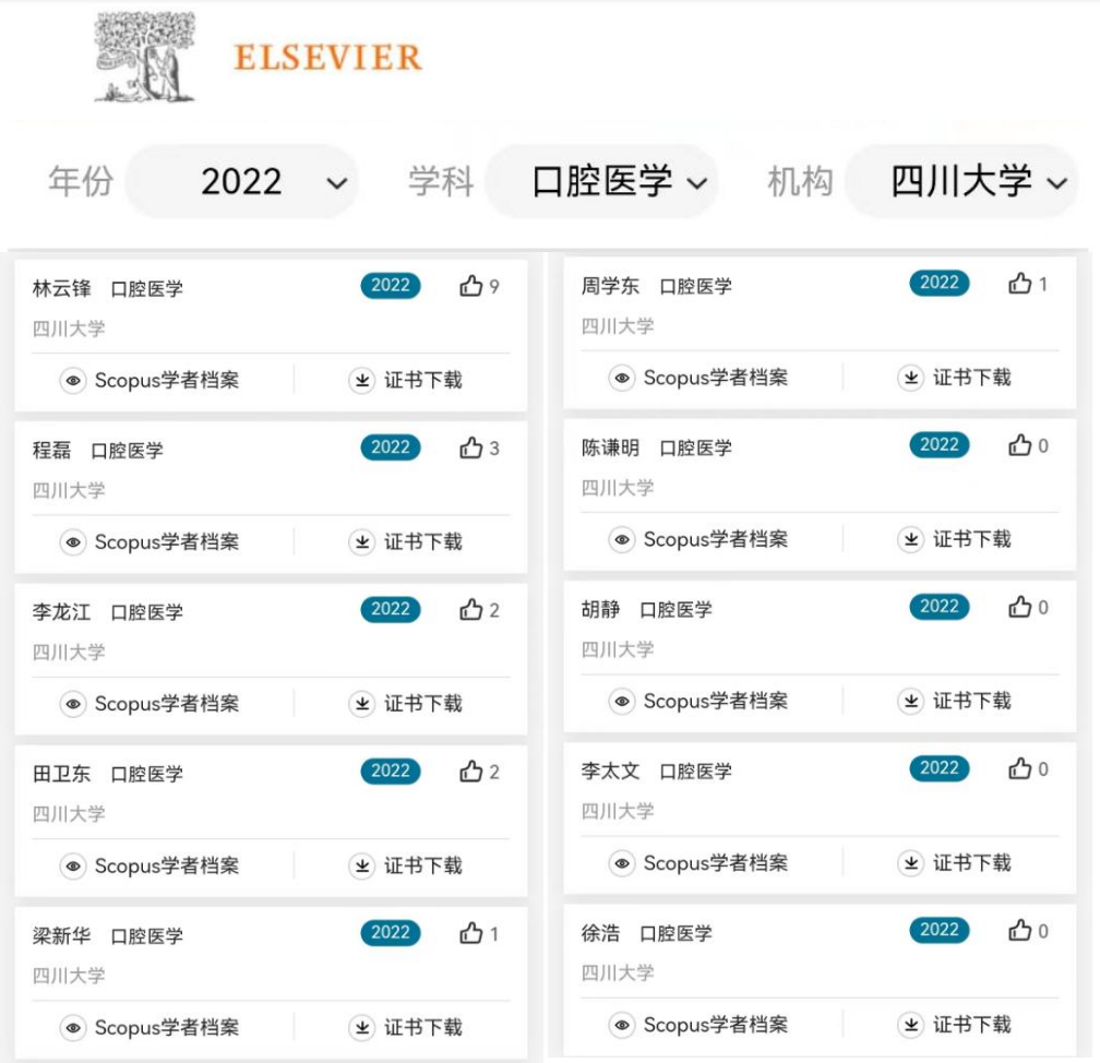 2023年3月28日,全球性信息分析机构爱思唯尔(Elsevier) 发布2022“中国高被引学者” (Highly Cited Chinese Researchers)榜单。国内口腔医学领域29位学者上榜,其中我院周学东、林云锋、李太文、胡静、陈谦明、程磊、田卫东、李龙江、梁新华、徐浩10位学者上榜,上榜学者数再创历史新高,居国内口腔医学领域第一。