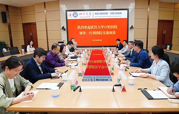 4月20日,武汉大学口腔医院院长尚政军、党委副书记马博懿、副院长程勇等一行到我院访问交流,我院党委书记谭静、党委副书记林云峰、副院长韩向龙,以及相关职能部门和临床科室负责人出席座谈交流会。