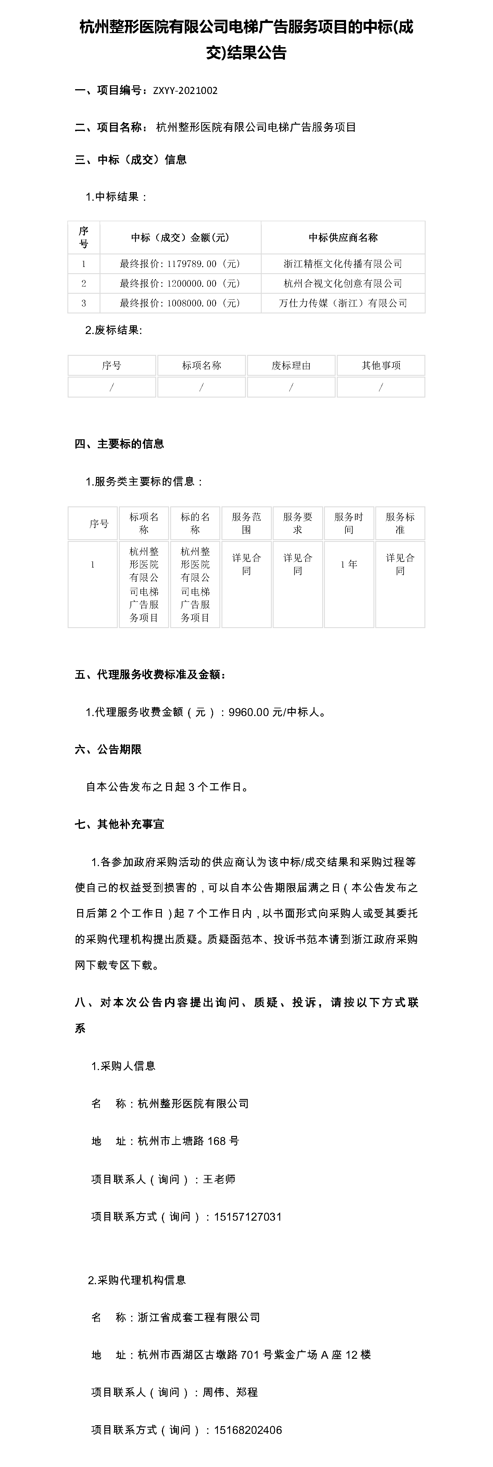 杭州整形医院有限公司电梯广告服务项目的中标(成交)结果公告