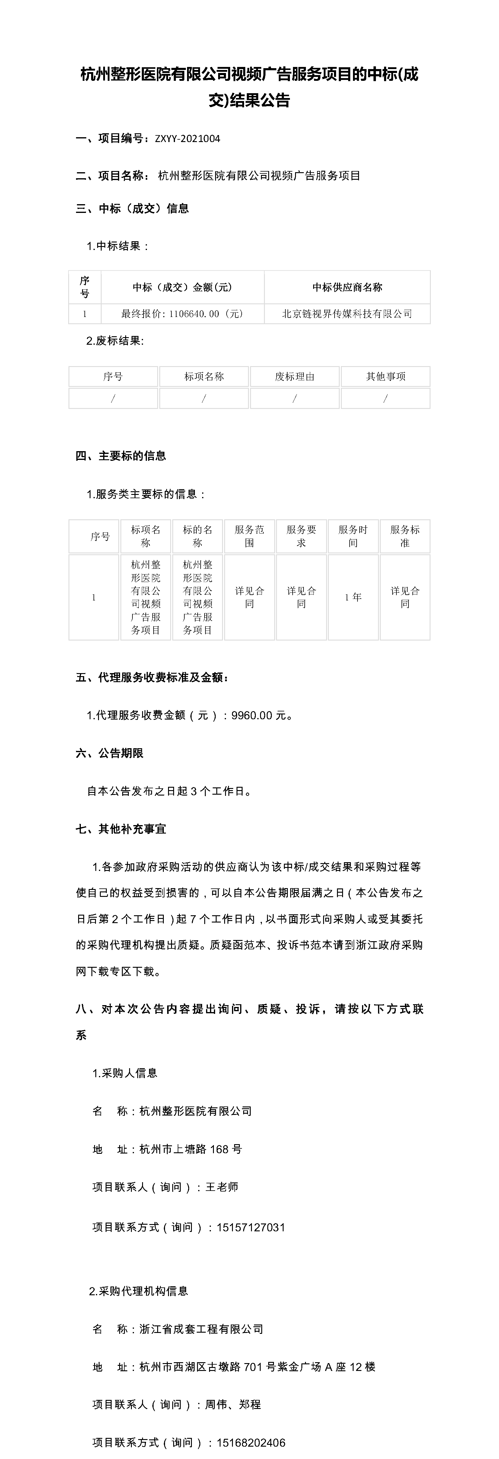 杭州整形医院有限公司视频广告服务项目的中标(成交)结果公告