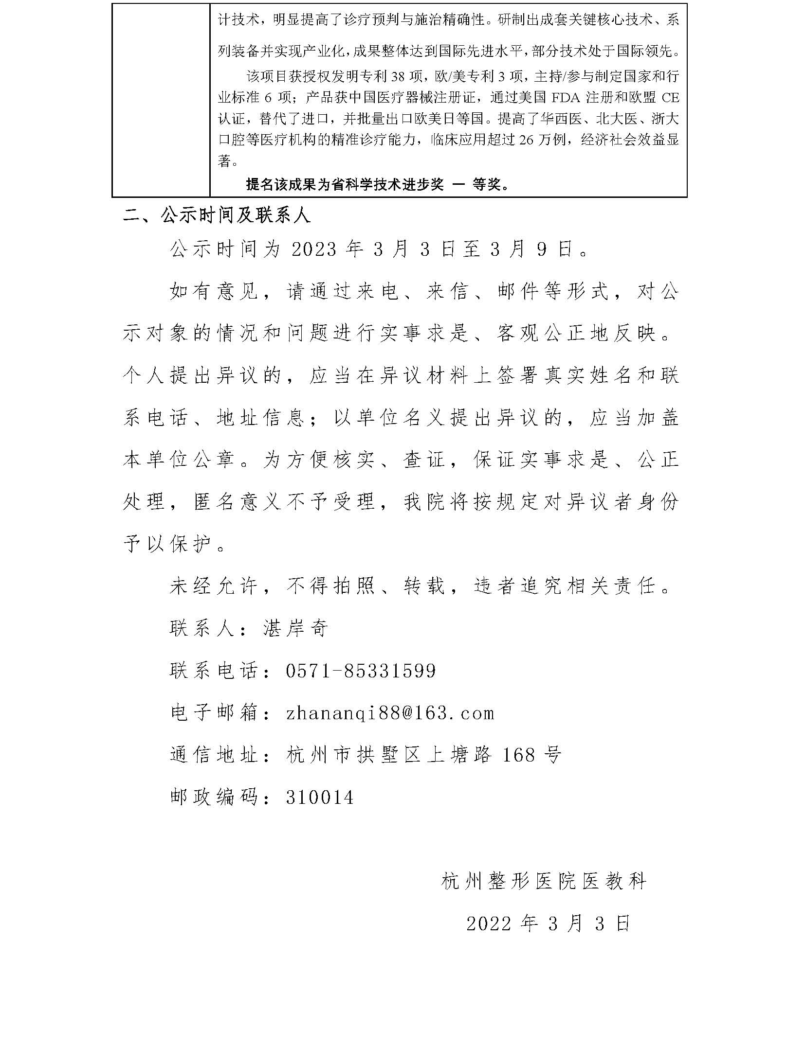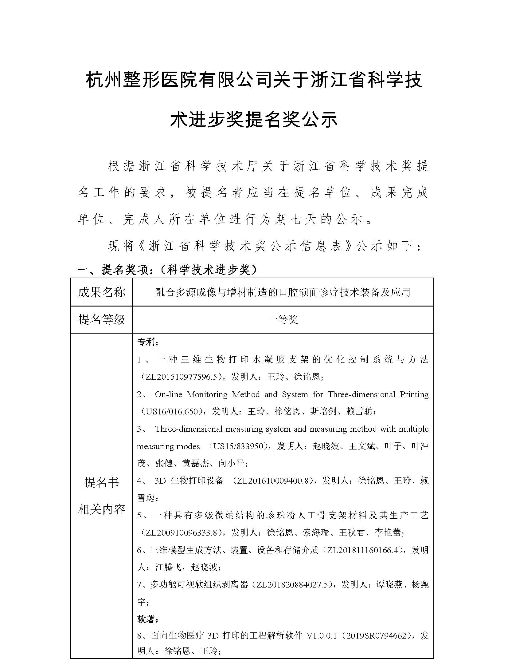 杭州整形医院有限公司关于浙江省科学技术进步奖提名奖公示