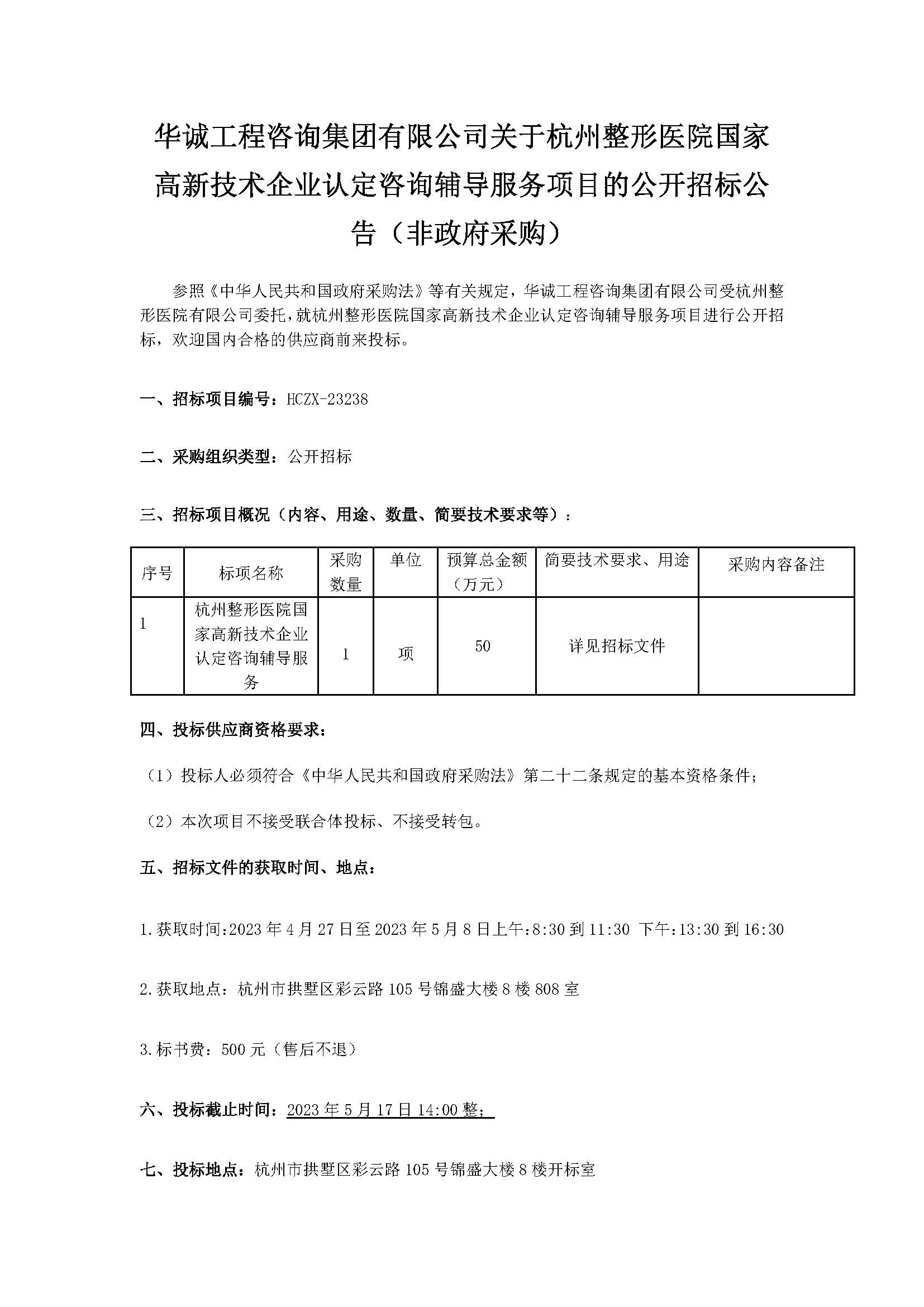 华诚工程咨询集团有限公司关于杭州整形医院国家高新技术企业认定咨询辅导服务项目的公开招标公告(非政府采购)