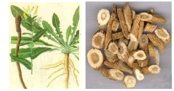 本品呈圆柱形,稍扭曲,长约10~20cm,直经约0.5~1cm,表面淡灰黄色或淡棕黄色,有纵皱纹、横长皮孔样突起,及支根痕。根头部略膨大,可见暗绿色或暗棕色轮状排列的叶柄残基和密集的疣状突起。体实,质略软,断面皮部黄白色,木质部黄色;气微,味微甜后苦涩。