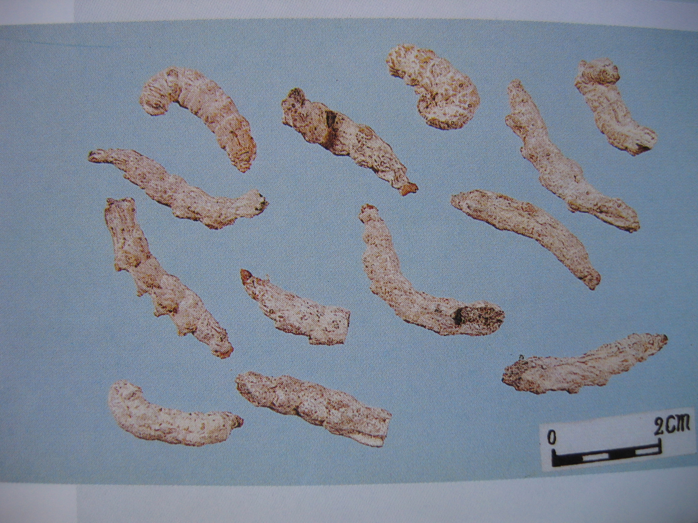 4、地蚕:其状如螺,又叫螺丝菜。“虫体”呈梭形。略弯曲,环纹较少,仅3~15条。外表淡黄色。