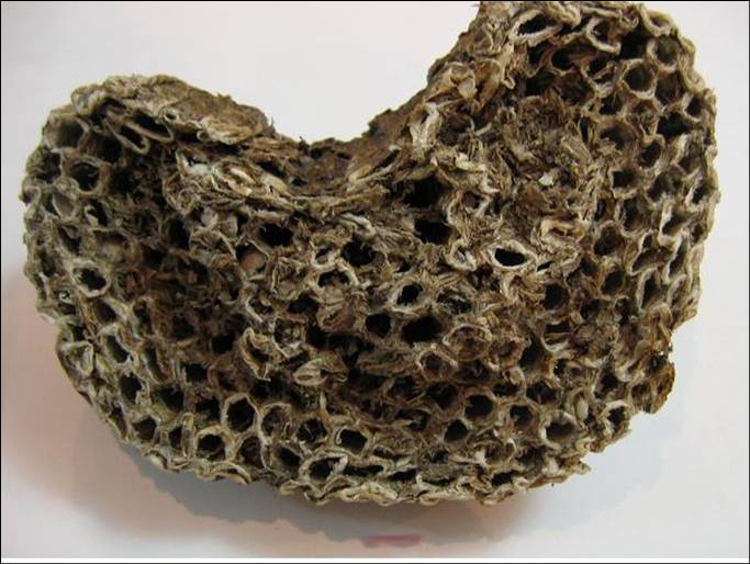 本品为小块状,灰黄色,腹面具多数整齐的六角形房孔,孔径3~4mm或6~8mm。体轻,稍有弹性和韧性,孔内无死蜂。气微,味辛淡。