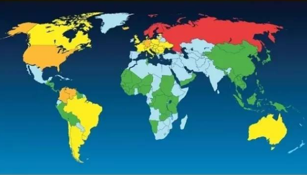 世界罩杯地图 红色代表>D杯 黄色代表C 浅蓝色代表B杯 绿色代表A杯