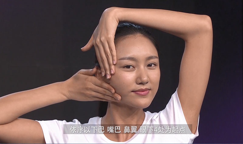Step 2:用中指、无名指指腹施压以画圈的方式作提拉按摩。先从嘴角两边按摩至耳朵;再是鼻翼两侧至太阳穴。