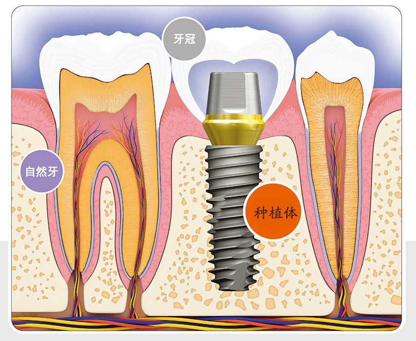 在牙槽骨中的种植体就相当于我们自然牙的牙根,它可以和牙槽骨紧密地生长成一体,所以能够稳稳地支撑并固定牙龈外的假牙。