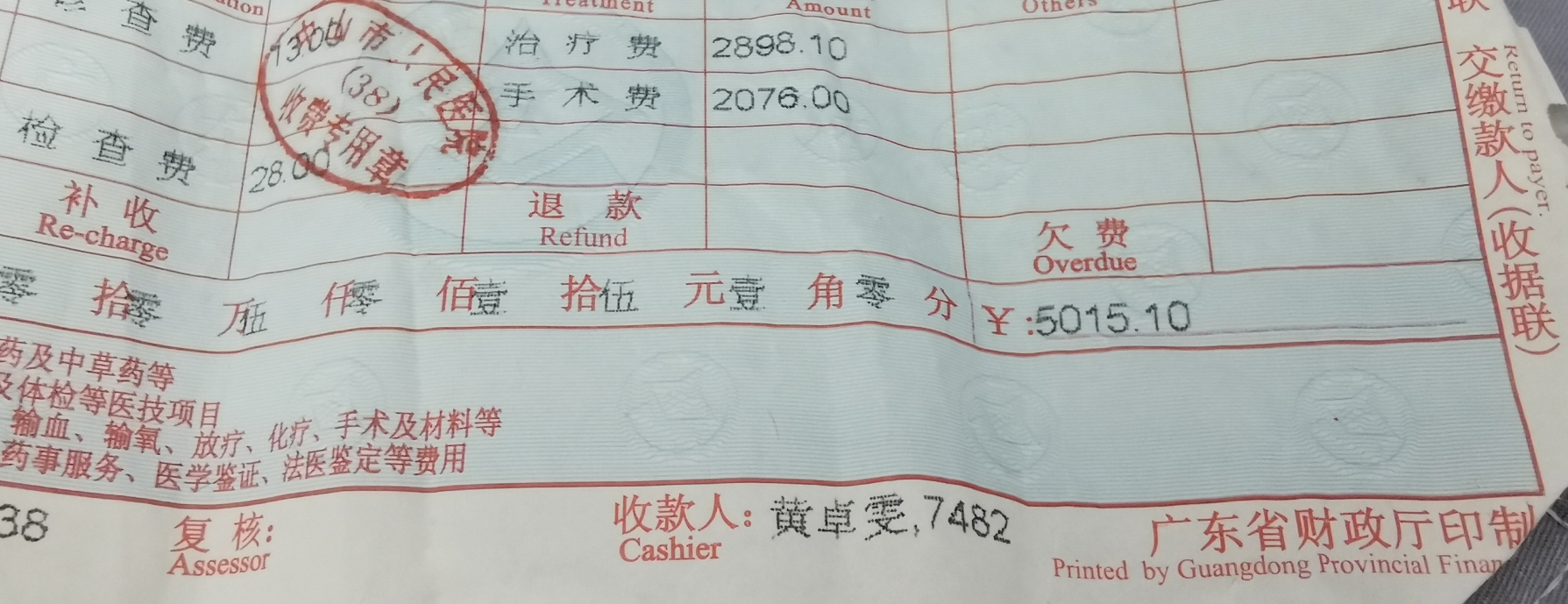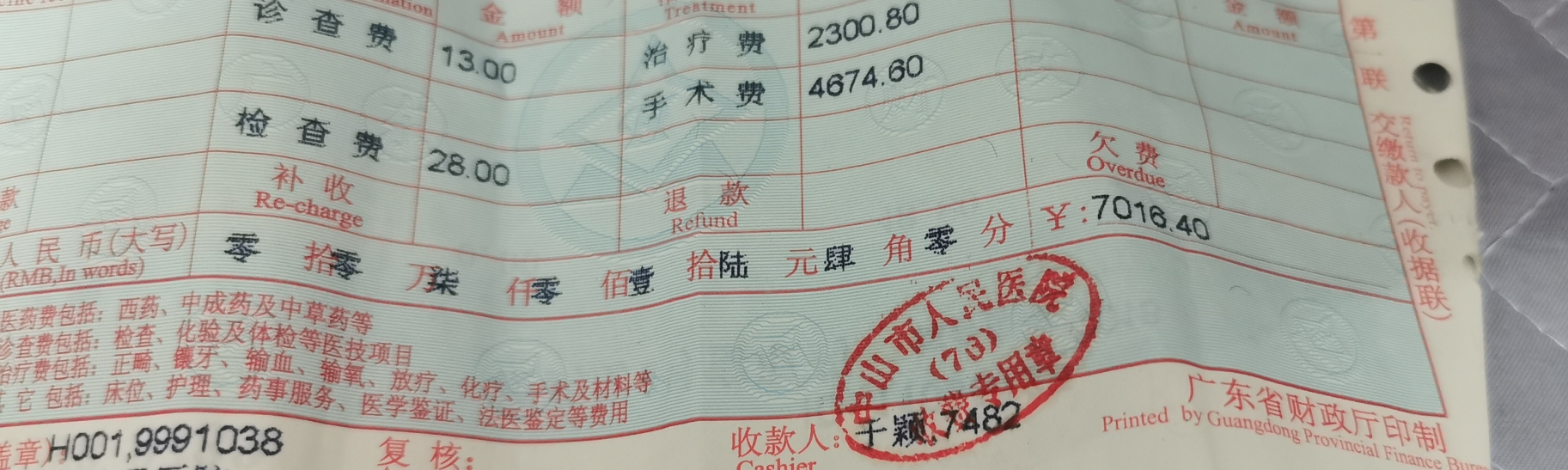 大概过了十分钟,护士用一块布将我的眼睛盖住了,医生就开始做手术了。手术过程中会用到一些仪器,医生大概是用那个仪器将种植体打入我的牙槽骨中,是一点一点打进去的,每次一怼,我就感觉我缺牙的位置在承受极大的力,虽然感觉不到痛,但是很恐怖,而且会立马涌出一大口血,当然护士会用吸管立马吸干净。我很担心会把我的压槽怼坏,也很担心万一怼深了或者麻药突然失效了,那一定会痛到挂了(这些都是我想象的)。大概怼了三四次,终于成功把种植体打入我的牙槽骨中,接着医生开始拧保护帽,然后缝线,缝了大概两三针。整个手术大约持续了20分钟,医生说比预期用时稍微长了一点儿,一般十来分钟就可以搞定了。医生给开了些止痛药、消炎药和漱口水,一期手术费花了7016.4.医生让我三个月之后去医院复查种植体生长情况,评估带牙时间。