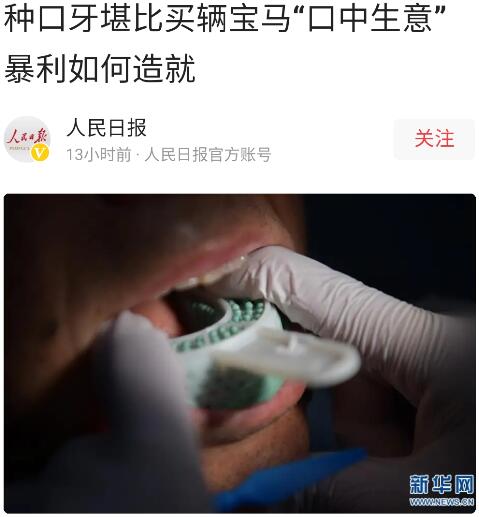 最近,种口牙堪比买辆宝马车的段子再度流行起来,人民日报也发了《种口牙堪比买辆宝马车,“口中生意”暴利如何造就》的文章。