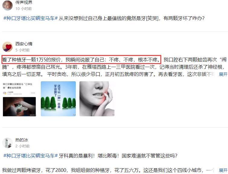 “我做过两颗烤瓷牙,花了2800.我姐姐做的种植牙,花了五六万。这还是我们这个四线小城市,一个不发达城市的价格。大城市的价格,更是惊人,说它堪比贩毒都不为过。”