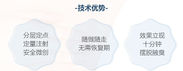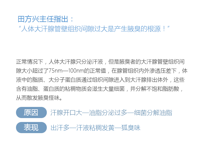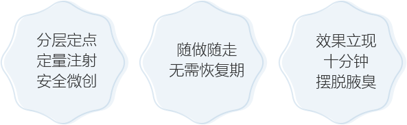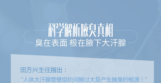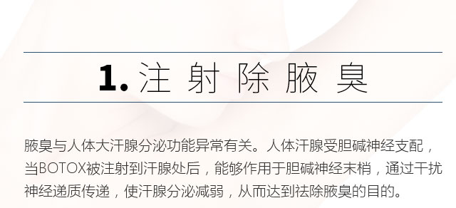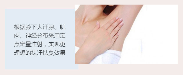 腋臭之所以发生,与人体大汗腺分泌功能异常有关。人体汗腺受胆碱神经支配,当BOTOX被注射到汗腺处后,能够作用于胆碱神经末梢,通过干扰神经递质传递,使汗腺分泌减弱,从而达到祛除腋臭的目的