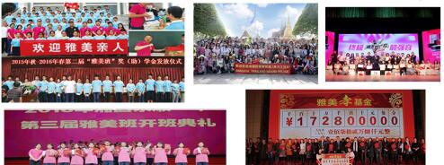 秉承爱文化和孝文化两大特色。16年的爱心助学历程,雅美每年2次深入湘西贫困地区走访,每年专项资金投入,政法频道通力协助,3个(4届)“雅美班”,500余名湘西贫困学子,30多位社会爱心人士,8次慈善捐助活动,累积捐出爱心善款及物资价值600余万元。
