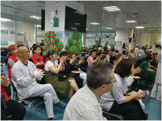 活动伊始,吴金斌老师以《甘心情愿》《映山红》的萨克斯乐声给我们带来了听觉盛宴,诉说着医务人员始终为患者服务的真情实意;王丽护士长用通俗易懂的语言为患者及家属讲述了饮食重要性、常见饮食误区、合理饮食结构等知识,以“讲故事”的方式给我们进行了一次别开生面的营养课程;护士志愿者饱含深情歌唱《阳光总在风雨后》,用歌声向患者及家属讲述着“不管风风雨雨,我们医护人员始终常伴左右”;《你比划,我来猜》医患互动游戏,彰显“医护一家亲”美好场面,更是让整个活动在一片欢声笑语中落下帷幕。