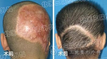 图上可以看出小李头皮缺损的面积非常大,对于这么大面积的瘢痕性秃发,要想兼顾毛发重建、恢复外观,不是一件容易的事情,我们科的医生为小李制定了头皮埋置扩张器后切除瘢痕的方案,手术主要分两期手术,第一次手术在正常头皮下埋置扩张器,经过三个月左右的注水扩张,将正常头皮面积扩大;第二次手术将疤痕切掉,用扩张出的带有毛发的正常头皮覆盖创面,修复没有毛发的瘢痕部位。