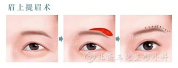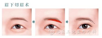 切眉术:切眉术是通过切除眉上(在眉上缘紧贴眉毛设计下切口线)或眉下(在眉下缘紧贴眉毛设计上切口线)部分多余皮肤,恢复眼周年轻状态,因此切眉术又分为眉上切口提上睑和眉下切口提上睑两种,眉上切口切眉术适用中老年眉下垂伴上睑皮肤松弛、八字眉、纹眉形态不佳等情况,在改善眉毛的位置的同时,可以提紧松弛的上睑皮肤,使其年轻化。眉下切口主要解决上睑皮肤松驰情况,使被遮盖的双眼皮显露,上睑年轻化。