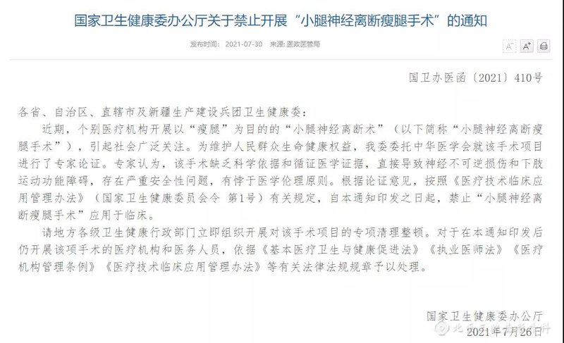 专家认为,该手术缺乏科学依据和循证医学证据,直接导致神经不可逆损伤和下肢运动功能障碍,存在严重安全性问题,有悖于医学伦理原则。根据论证意见,按照《医疗技术临床应用管理办法》(国家卫生健康委员会令 第1号)有关规定,发布了《关于禁止开展“小腿神经离断瘦腿手术”的通知》,自通知印发之日起,禁止“小腿神经离断瘦腿手术”应用于临床。