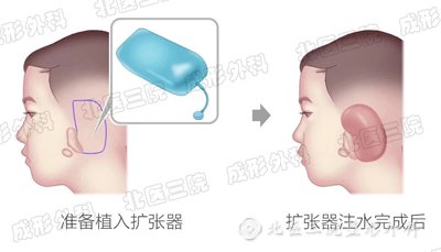 一般所需要的覆盖组织用皮肤扩张器方法解决,扩张器就像一个水囊,放到耳后的皮肤下面,逐渐向里面打水,让水囊变大,水囊把皮肤扩大,直至扩大到所需要的量。该患儿为双侧小儿畸形,故需在双侧耳后进行皮肤扩张器植入术,为外耳再造提供薄的、足够大的、有血运保障的皮瓣组织。